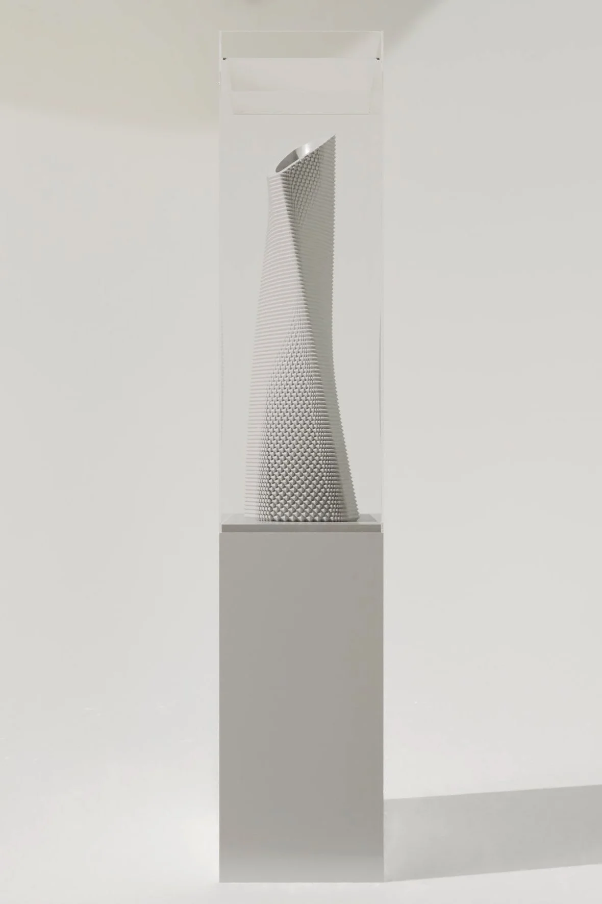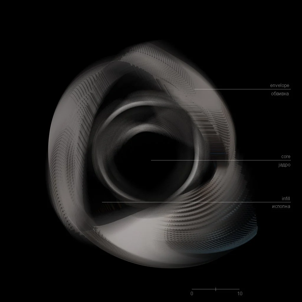 The foundational element of the architectural design is a central void, meticulously defined by a circular arrangement of horizontal circulation paths and individual housing units. This core cavity serves as the organizational heart of the structure, around which all other elements are oriented. Abutting the exterior of this ring is a dynamic and rotating form, creating a striking contrast with the contained inner core and suggesting a sense of movement and evolution within the overall static framework. This interplay between the fixed internal structure and the fluid external shell contributes to a unique and compelling architectural statement.